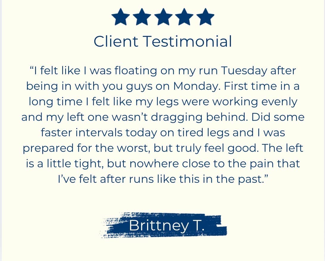 Brittney has already had runs and workouts without pain or limitation. Movements and exercises that previously triggered discomfort are no longer doing so, and she is just getting started.